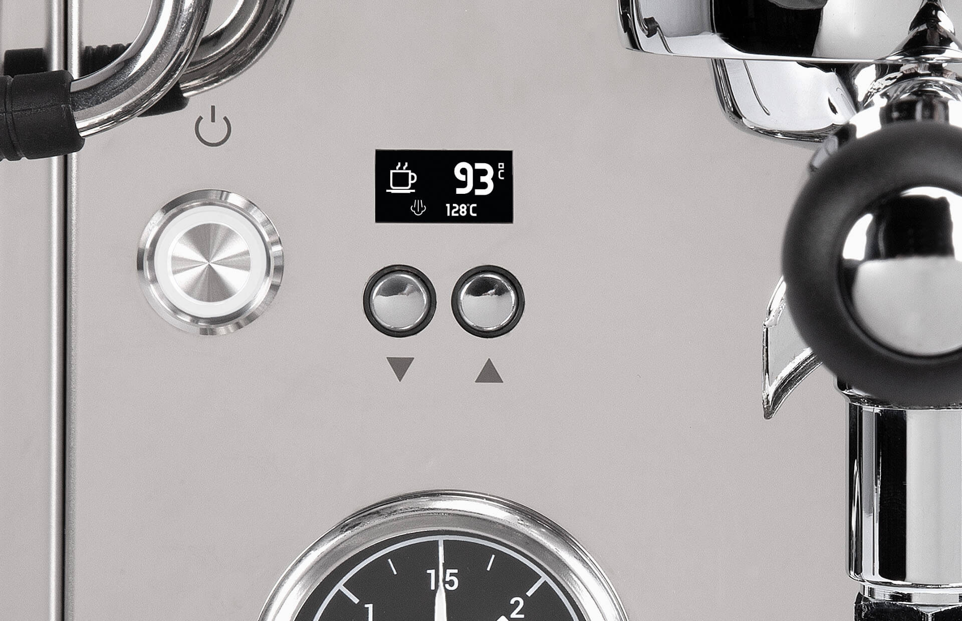 Die PID-Steuerung erlaubt eine individuelle Temperatureinstellung beider Boiler. Das dezente Display liefert exakte Informationen zur Shot-Dauer und weiteren Parametern.