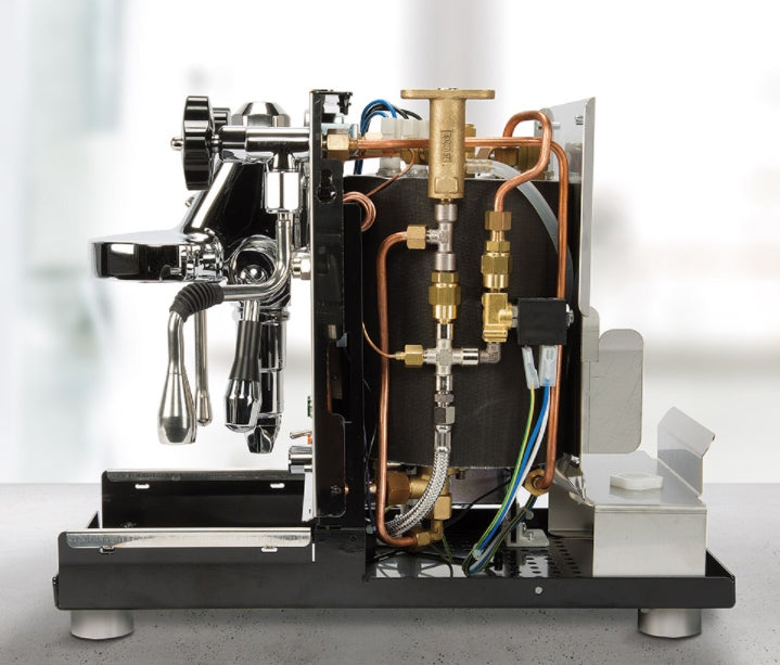 Bellissime! Cette petite machine à double circuit impressionne par ses beaux détails. Les boutons pour vapeur/vapeur et eau/aqua sont non seulement beaux, mais tournent aussi doucement que du beurre. Un quart de tour suffit et la vapeur sort forte et sèche. Offrir des cappuccinos aux visiteurs ? Pas de problème avec le Mechanika Slim, il fait mousser le lait sans effort pour plusieurs cappuccinos. Les deux porte-filtres de haute qualité sont de qualité exclusive et lourde et tiennent de manière ergonomique dans la main. Lors de la préparation d'un expresso, le levier typique de l'E61 se distingue par sa mécanique fluide ; la pompe vibrante montée silencieusement confirme l'impression qu'elle a été conçue dans les moindres détails.